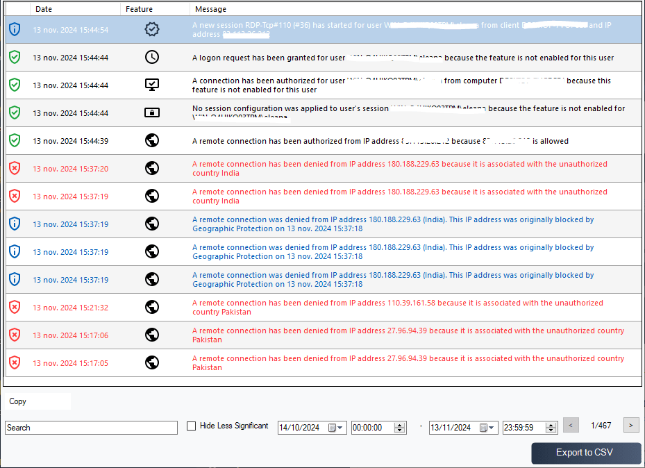 Easily configure the maximum logon attempts by IP address. In addition, Bruteforce Protection displays the current status of the Advanced Security service, Windows Firewall, Windows Logon Audit and HTML5 web portal logs.